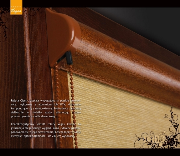 Vegas Classic to cieszący się uznaniem klientów system roletowy w eleganckiej, opływowej kasecie aluminiowej, montowany na wkręty do listwy przyszybowej. Płaskie prowadnice wykonane z aluminium lub PVC klejone są za pomocą taśmy piankowej do listew przyszybowych. Prowadnice zachodzą w światło szyby.